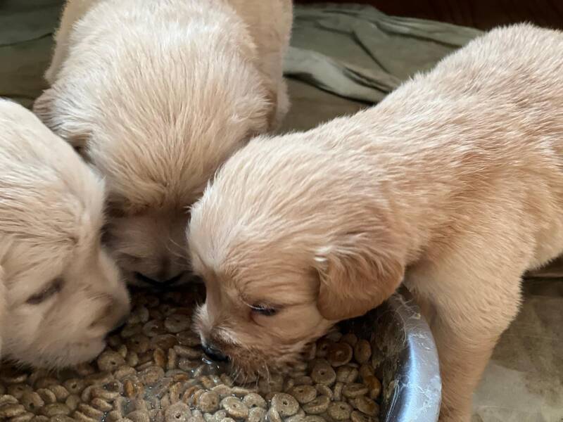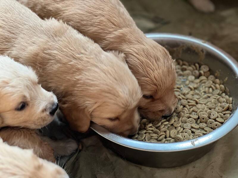 Vandaag stond er voor het eerst een echte groepsmaaltijd op het menu. De pups ontdekten samen hun nieuwe voerbak en dat ging gepaard met veel gesmak, gesnuif en natte pootjes. Mama hield alles goed in de gaten en likte nadien zelfs een mondhoekje proper.