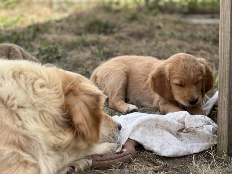 Ondertussen genoten de andere pups nog van samen spelen, graven en knuffelen in de tuin.